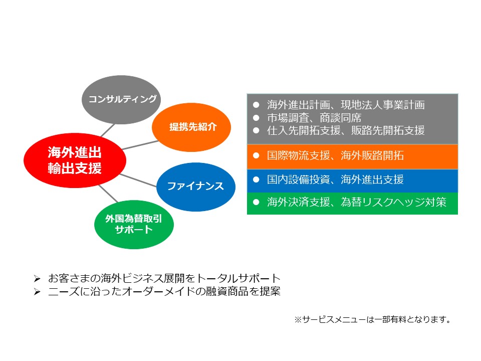 当社グループでは、国内外の専門機関などと連携し、海外セミナー・個別相談会の開催や、海外進出、海外仕入、販路開拓支援、貿易取引など、お客さまのニーズに応じたサポートを行っています。