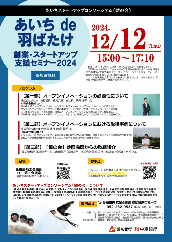 あいち銀行、愛知キャピタル、愛知県信用保証協会、名古屋市信用保証協会、名古屋商工会議所、日本政策金融公庫が連携し、愛知県を中心とした東海地域のスタートアップ企業の発掘、支援を目的として2022年9月にあいちスタートアップコンソーシアム「雛の会」を設立しました。各支援機関と連携、協働し、イノベーション創出の重要な担い手となるスタートアップ企業への金融支援のほか、共同セミナーの開催やアントレプレナーシップ教育への取組みを通じて持続可能な社会づくりへの貢献を目指しています。