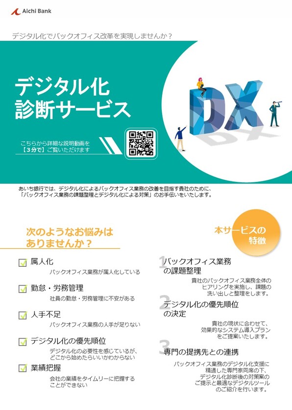 本サービスは、事業者様向けに「バックオフィス業務の課題整理とデジタル化による対策」をサポートするものです。お客さまや地域社会のIT化・DXに関する支援は地域金融機関としての重要な役割の一つであり、2024年4月よりあいちフィナンシャルグループに加わった高品質なシステムサービスを提供するAASTグループとともに、お客さまのデジタル分野における課題解決に取り組んでまいります。
