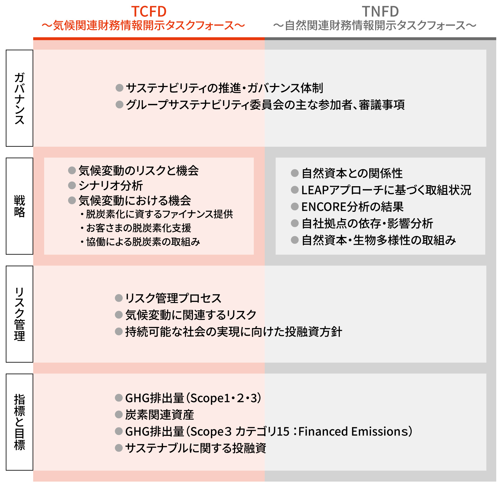 また、TCFDとTNFDの開示フレームワークには共通している項目も多く、統合的なアプローチを取ることで、より整合性の取れた情報開示が可能となることから、下記のような形で整理・公表しています。