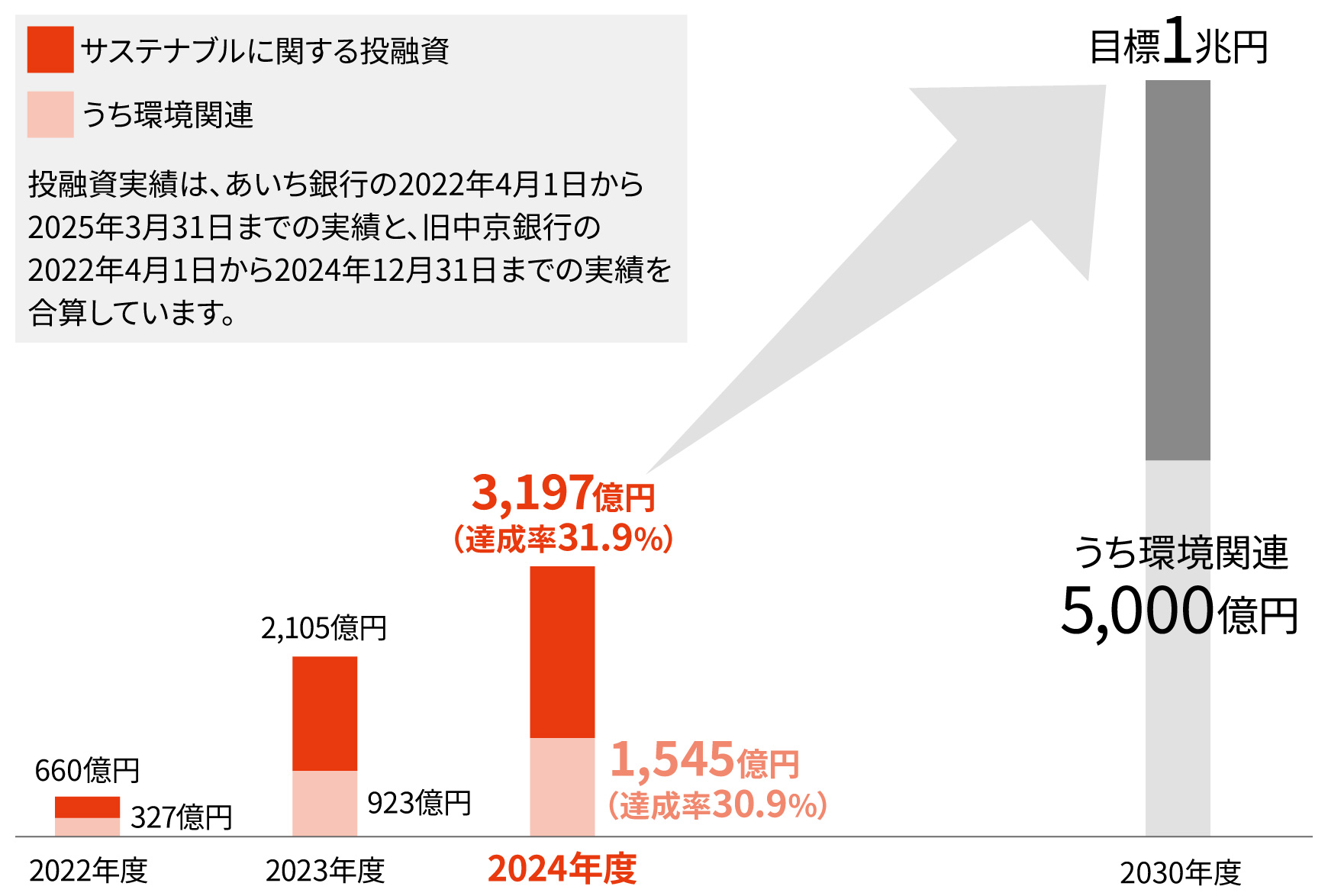 当社グループでは、サステナブルに関する投融資を2022年度から2030年度までに累計1兆円(うち環境関連で5,000億円)実行することを目標に設定しています。